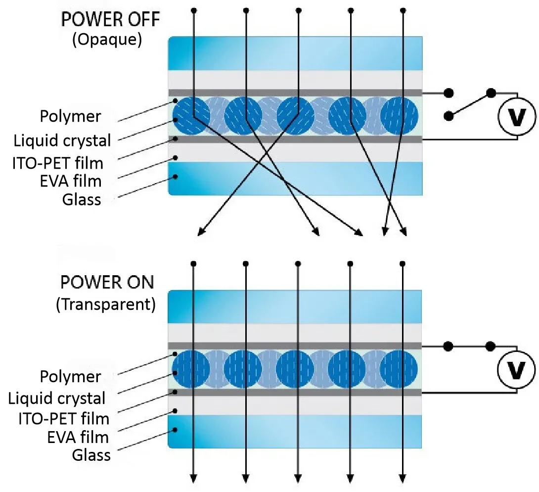 Smart switchable film is a product that is capable of adjusting light transmission between transparent and opaque using AC power. The secret of its characteristic is the polymer dispersed liquid crystal technology. Liquid crystals molecules in the film are randomly oriented. When the power is OFF, the crystals scatter the light and the product appears shaded. When an electronic current is applied and the product is ON, the liquid crystal molecules align and the inside light can penetrate through it. Thus, the product appears transparent.