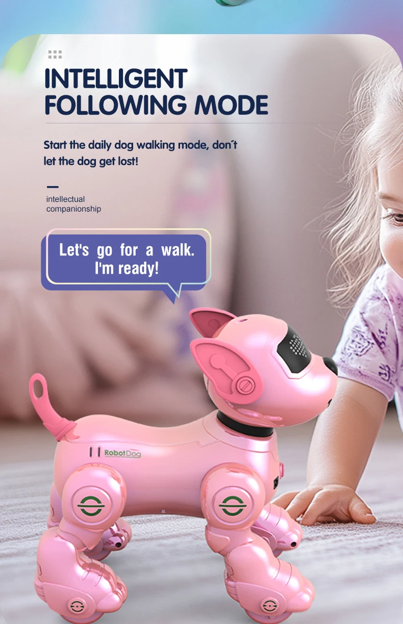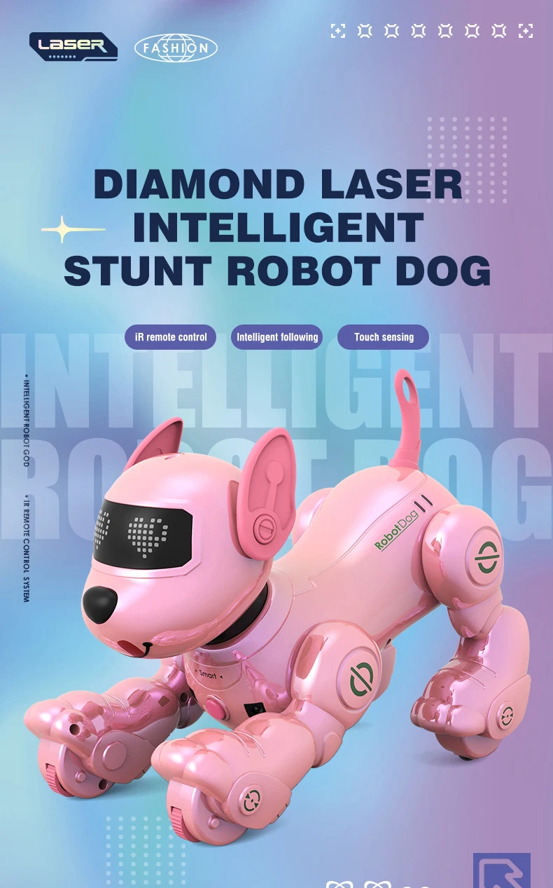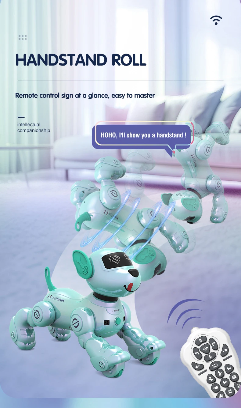 An intelligent remote control robot dog that can stand on its head, roll over, perform musical stunts and dance combinations.