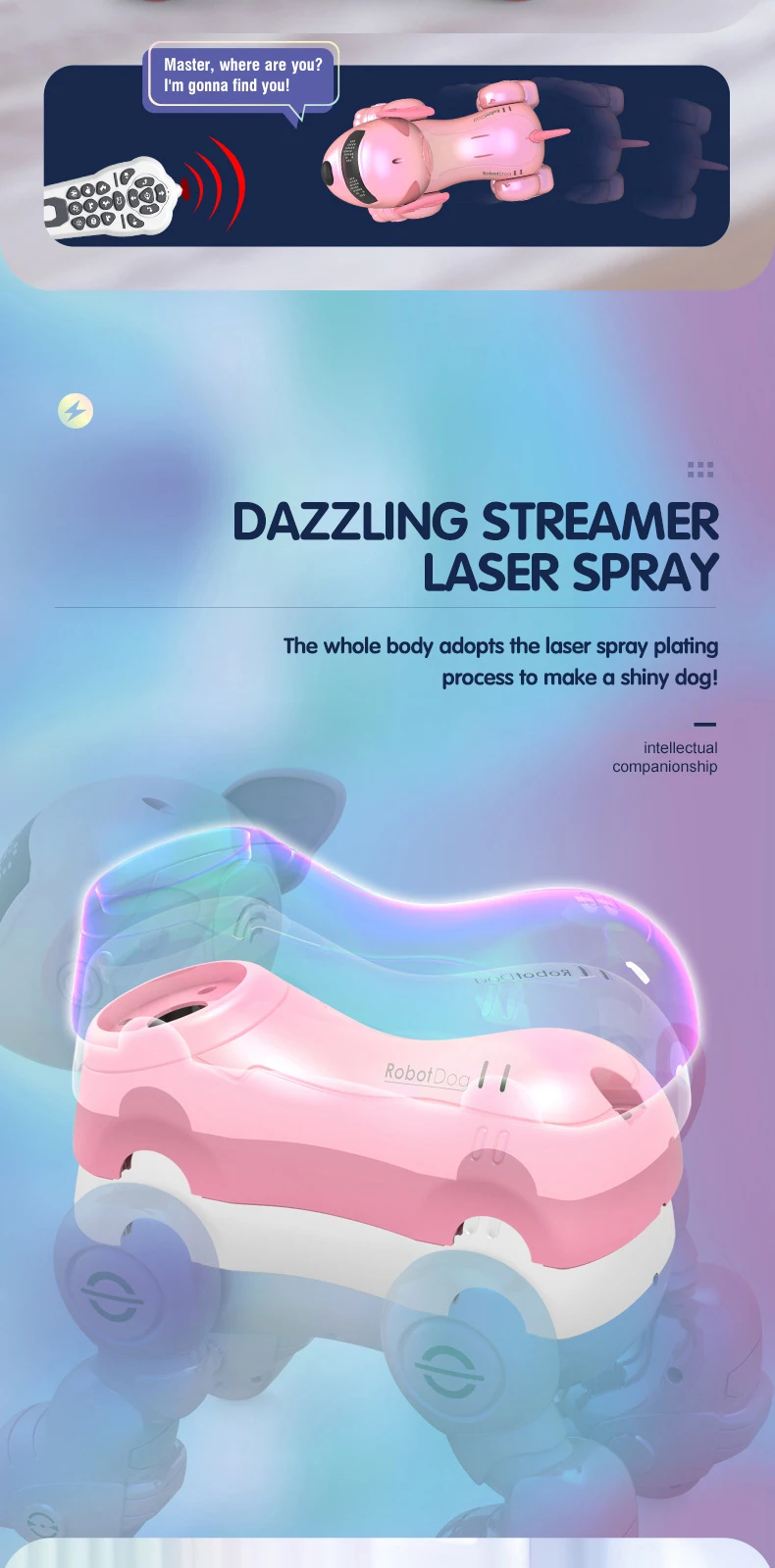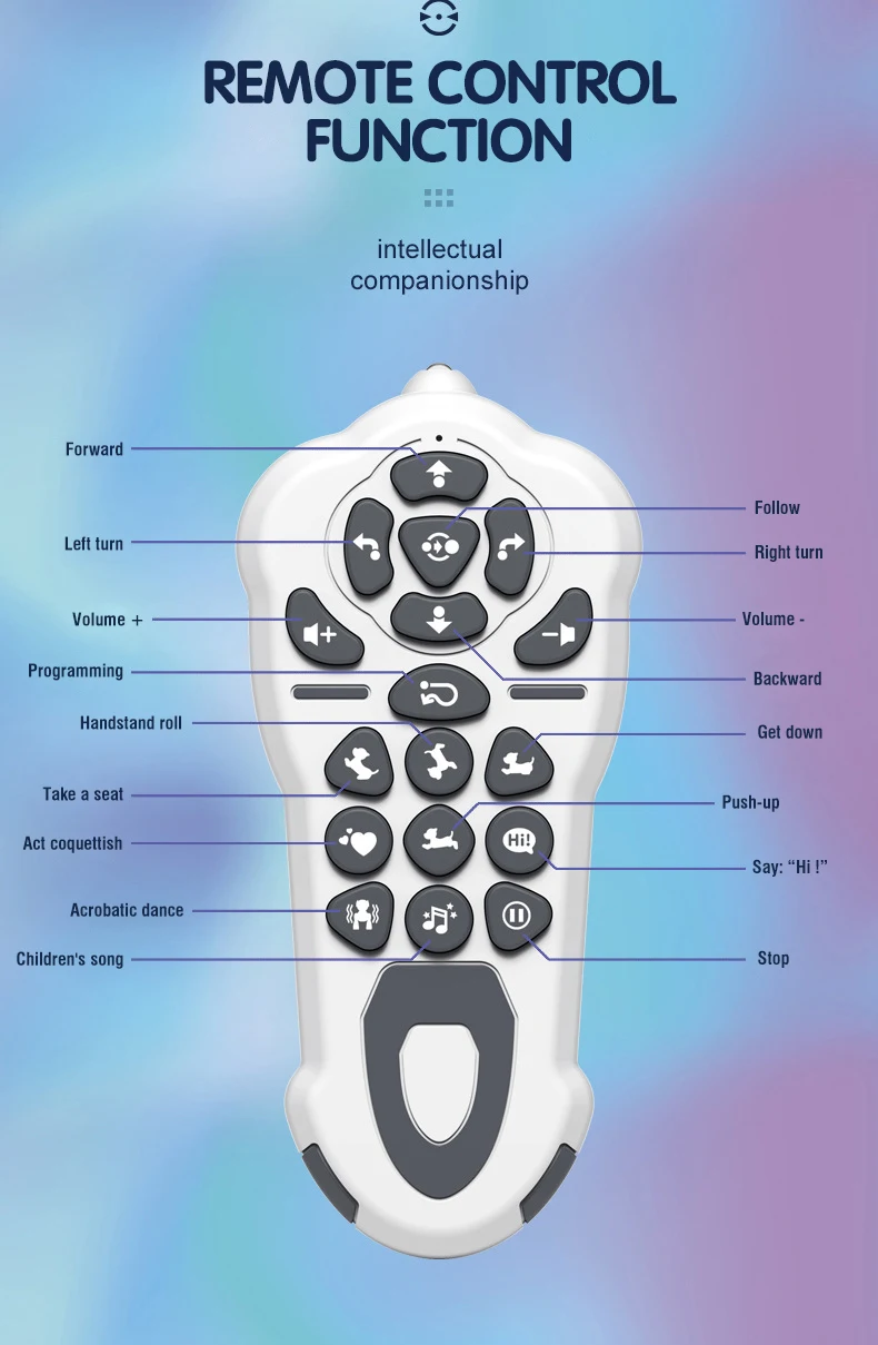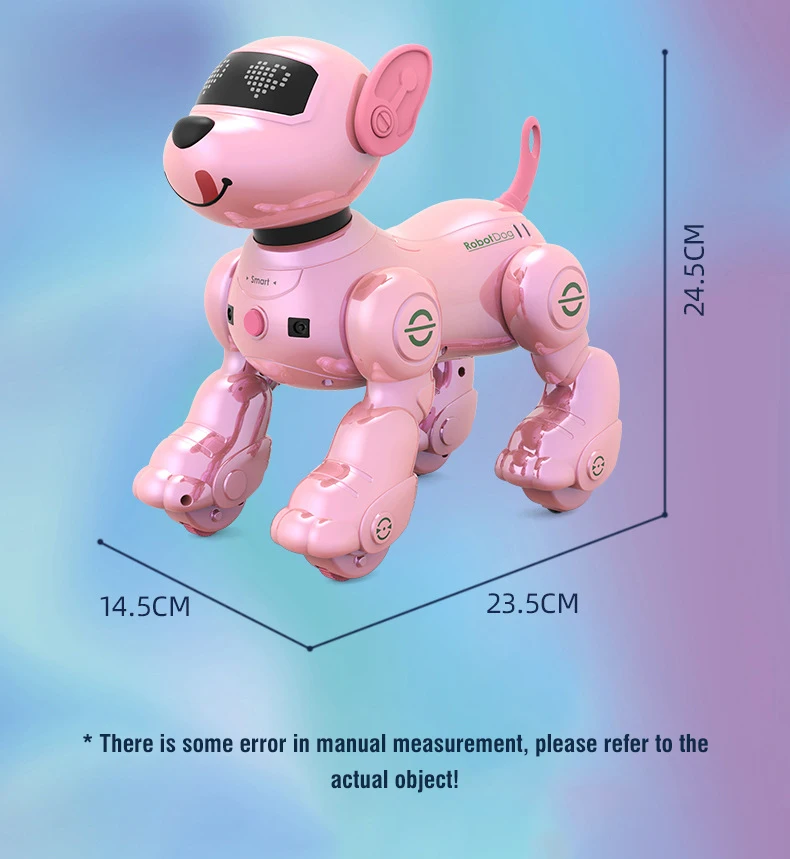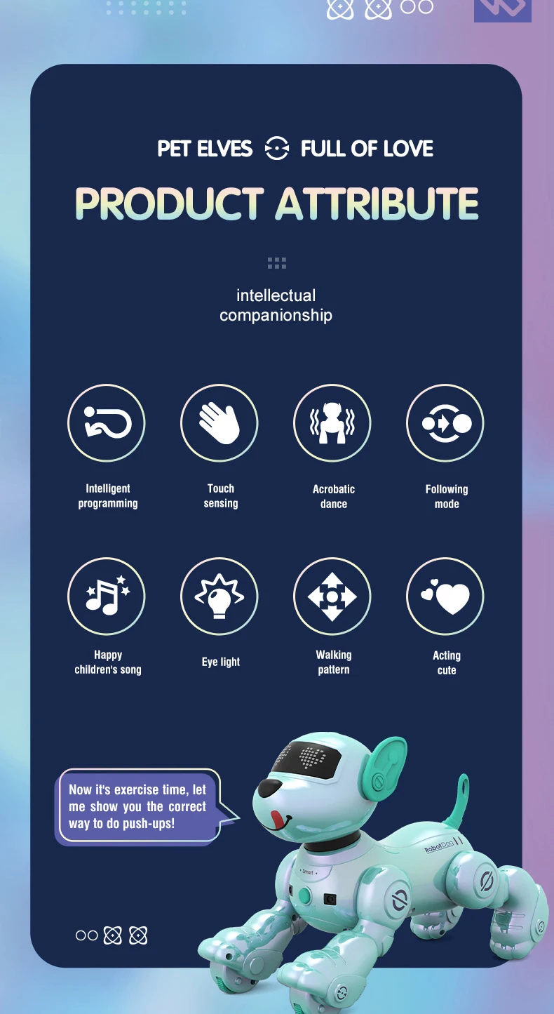 An intelligent remote control robot dog that can stand on its head, roll over, perform musical stunts and dance combinations.