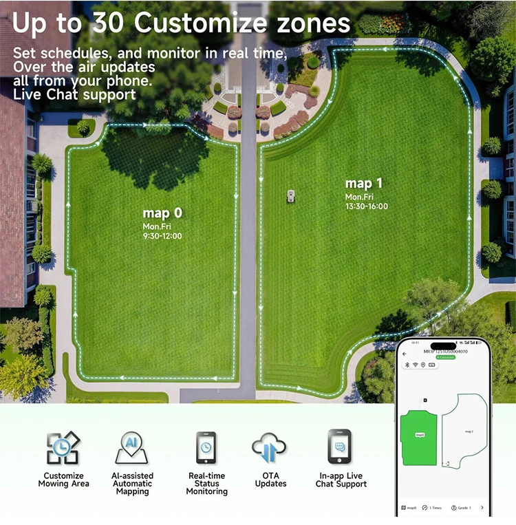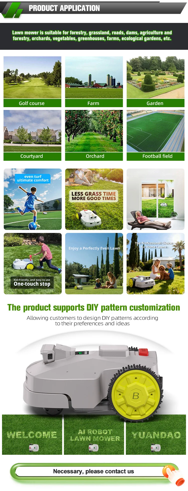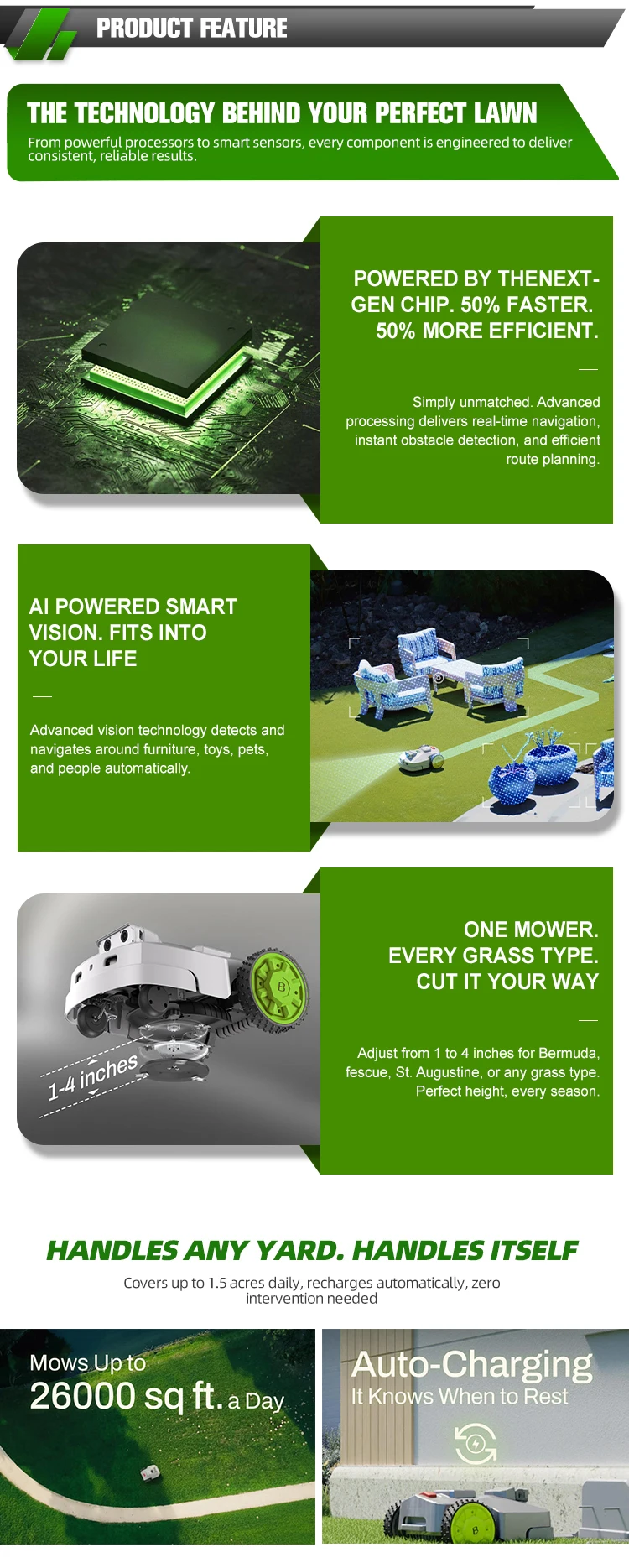 Our intelligent lawn mower utilizes artificial intelligence and visual perception to cut grass accurately and efficiently. It has a multi-sensor fusion positioning system that can identify and draw the boundaries of the lawn without any wires or wooden stakes. It can also automatically plan the best mowing path, saving you time and energy.