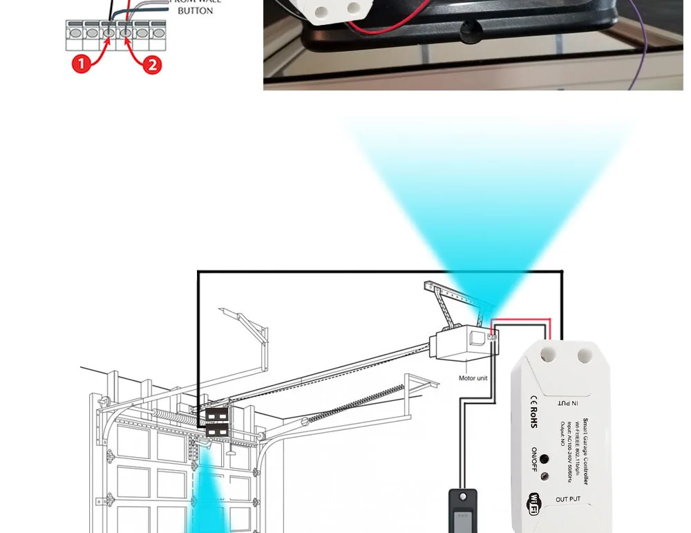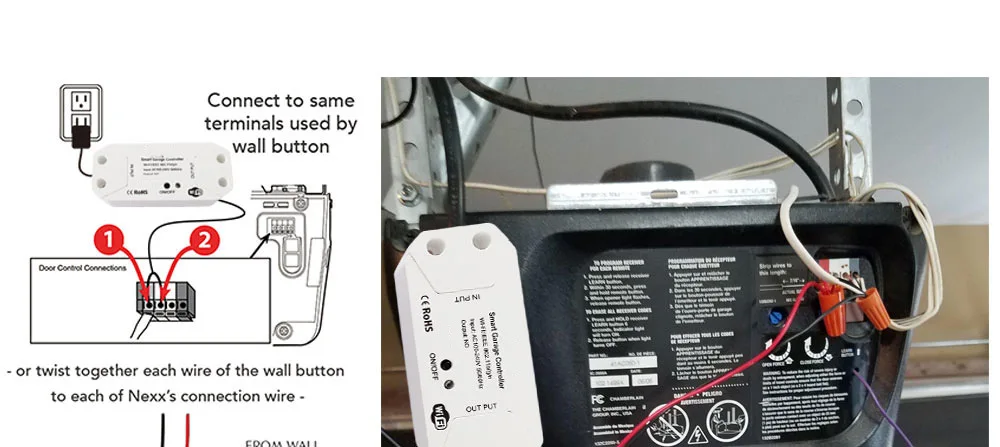 Take a wire with both ends stripped or a straightened-out paper clip to short-circuit the wall button terminal on the opener (I marked with red color). If the garage door opens or closes, it can work with our smart controller.